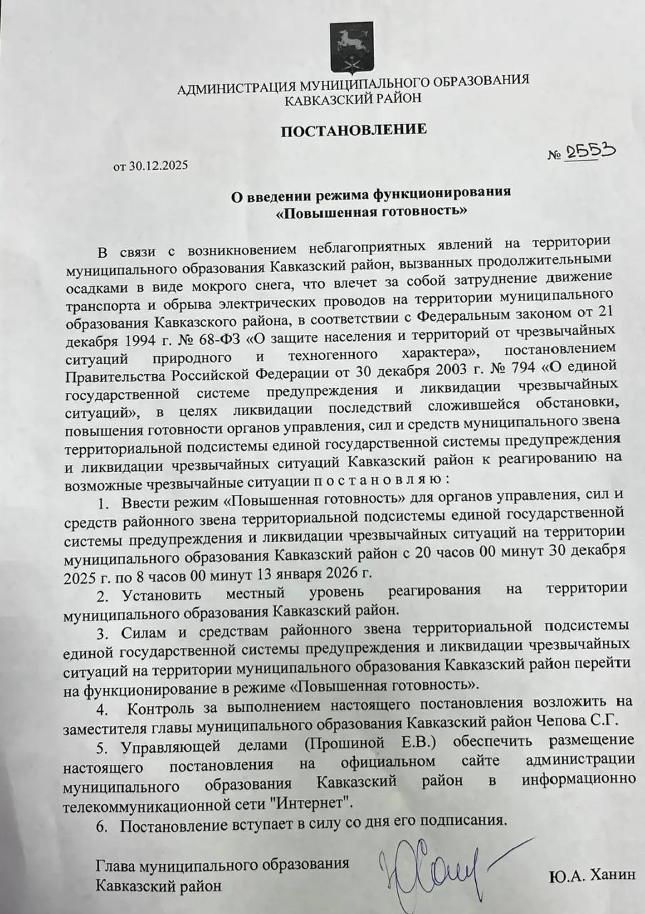 Постановление администрации муниципального образования Кавказский район № 2553 от 30.12.2025 О введении режима функционирования "Повышенная готовность" (скачать файл)